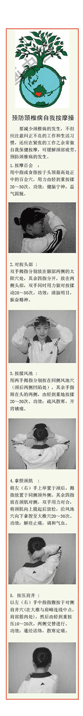 用左(右)手拇指尖放在右(左)手内关穴 掌横 纹以上 2 寸,两肌腱之间),中指放在对侧的外关穴(内关穴对面),同时对合用力按揉 1 分钟,双手交替进行。功效:宁心通络,宽胸行气。